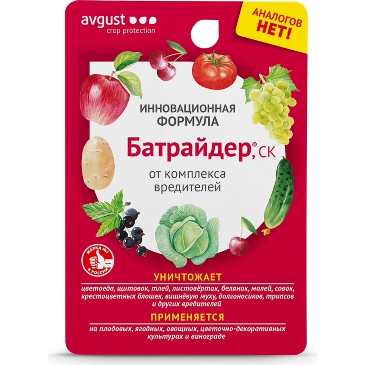 Как это может быть возможным? Батрайдер содержит три самых эффективных на сегодня действующих вещества разной направленности, что позволяет одной обработкой уничтожать большинство распространенных вредителей, в том числе яблонного цветоеда, разные виды щитовок, тли, трипсов, листоверток, совок, белянок, молей, крестоцветных блошек, долгоносиков и др.