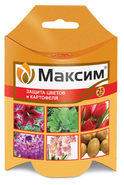 «Максим» — Препарат защитно-контактного действия для защиты от болезней луковичных (тюльпаны, гладиолусы, лилии и т.д.), георгинов, пионов, корней и корневищ других цветов, а также семенного картофеля. Создает защитный барьер на поверхности посадочного материала и в прикорневой зоне в почве. Эффективен против всех видов гнилей, плесеней, фузариоза, ризоктониоза, парши и других заболеваний. Защищает растения от болезней в течение всего периода роста и хранения.